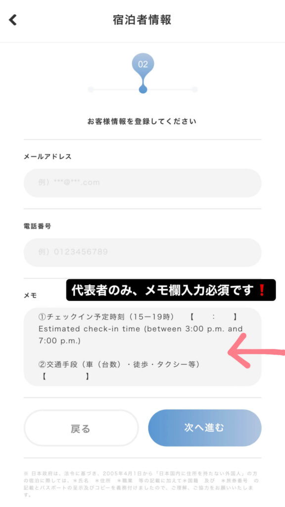 ”①チェックイン時間②交通手段”を必ずご記入ください。