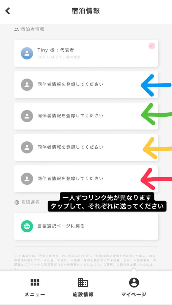 詳細は、宿泊者名簿登録のマイページをご参照ください。