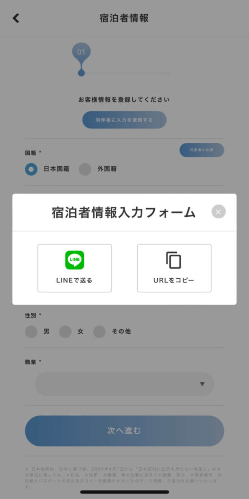 宿泊者情報の入力画面: